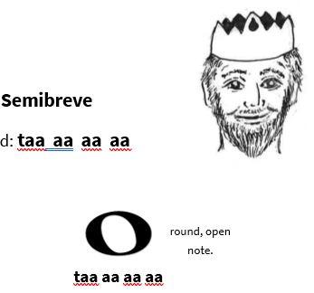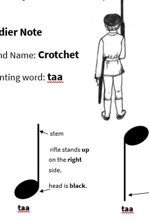 - Note & Rest Values: The note value names semibreve, minim, crotchet and quaver are used and rhythm is taught by means of the taa/saa French counting system. The various note values are characters in the Kingdom of Music.